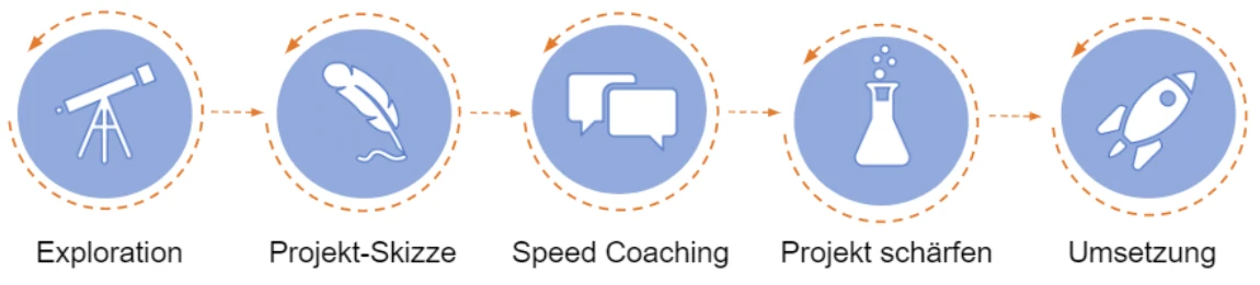 Um sicher zu gehen, dass mit deiner Idee eine relevante Herausforderung deiner Zielgruppe mit dem besten Lösungsansatz gelöst wird, ist ein Intensiv-Format das richtige Instrument: In Rekordzeit und ohne Ablenkung überprüfst du deine Idee in der Realität. Dies wird oft „Accelerator“ oder „Booster“ genannt.
